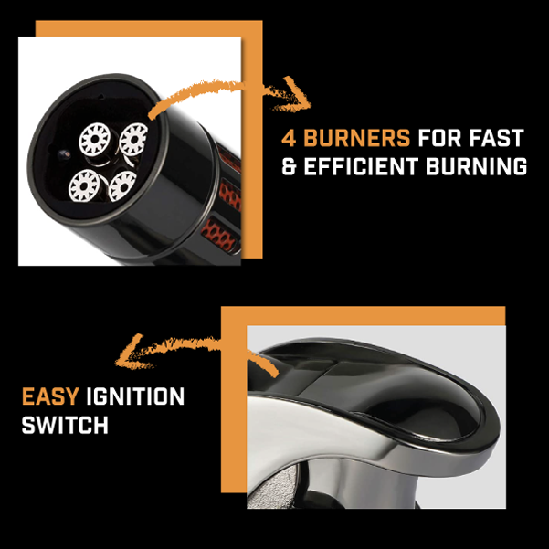 Our kit includes a culinary torch for burning wood chips. The torch has four burners which is much more efficient for smoking cocktails vs. other single burner torches. It uses less butane, lights with a simple thumb trigger, and pushes the smoke down into the cocktail glass as it burns. The sleek design looks great and stores easily in the box.