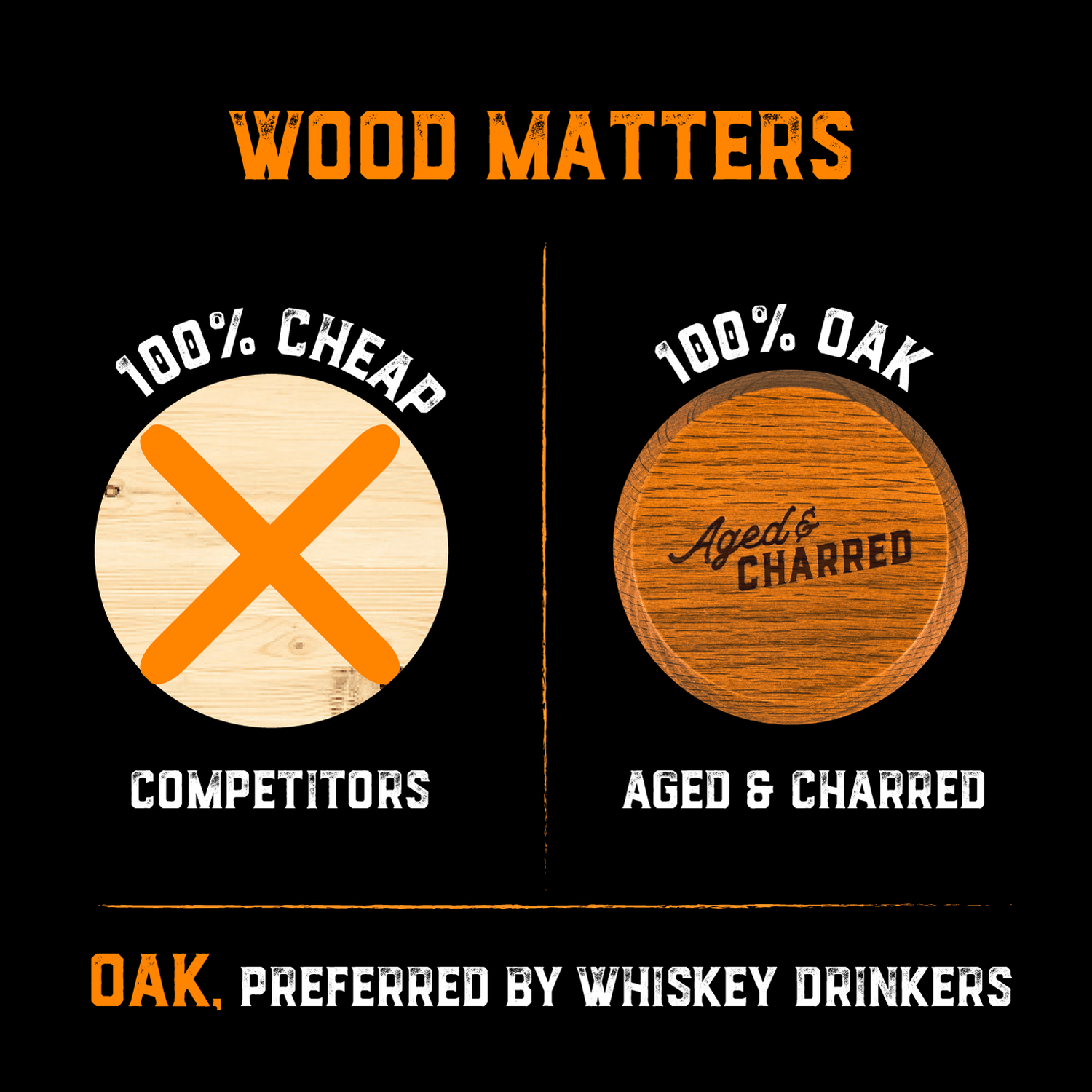 Wood matters when it comes to cocktail smokers. The Smoke Lid is made from 100% oak, just like the barrels whiskey is aged in. As the wood chips burn, part of the cocktail smoker may catch some heat and burn as well. This is fine as long as it's a wood made for whiskey. Cheaper woods are not and can create a foul smell and odor when burned. Each Smoke Lid is also cut whole from a piece of oak wood, to avoid any glue or wood pattern mismatch.