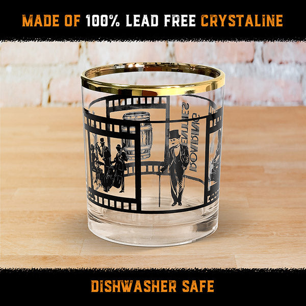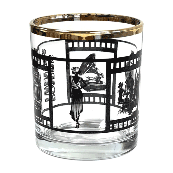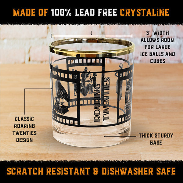 Set of four lead-free crystalline vintage rocks glasses which pay tribute to the social revolution of the 1920s fueled by flapper fashion, jazz, and a spirit of rebellion. The unique design with gold rim makes for a great conversation piece, or for the jazz age enthusiast.
