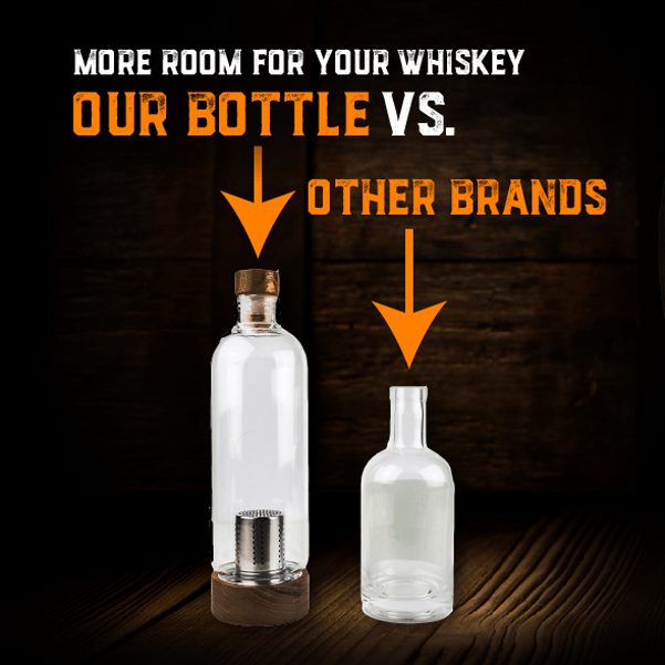 The Aged & Charred infusion vessel is almost 2x larger than competitor brands. Infusion almost an entire 750ml bottle with the whiskey infusion kit. (Don't forget to save a sample from the bottle to compare the before and after!) A larger bottle allows means more infused bourbon and whiskey for you. If you're going to take the time to infuse whiskey or bourbon, you want enough to make it last a long time for maximum enjoyment.